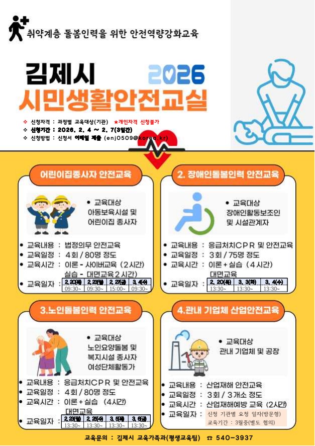 2026 김제시 시민생활안전교육 신청안내 교육가족과 063-540-3937 2026.02.03 235 담당부서교육가족과 연락처063-540-3937 첨부파일 2026 시민생활안전교실 교육신청서-게시용.hwpx (580 kb)다운로드미리보기 목록