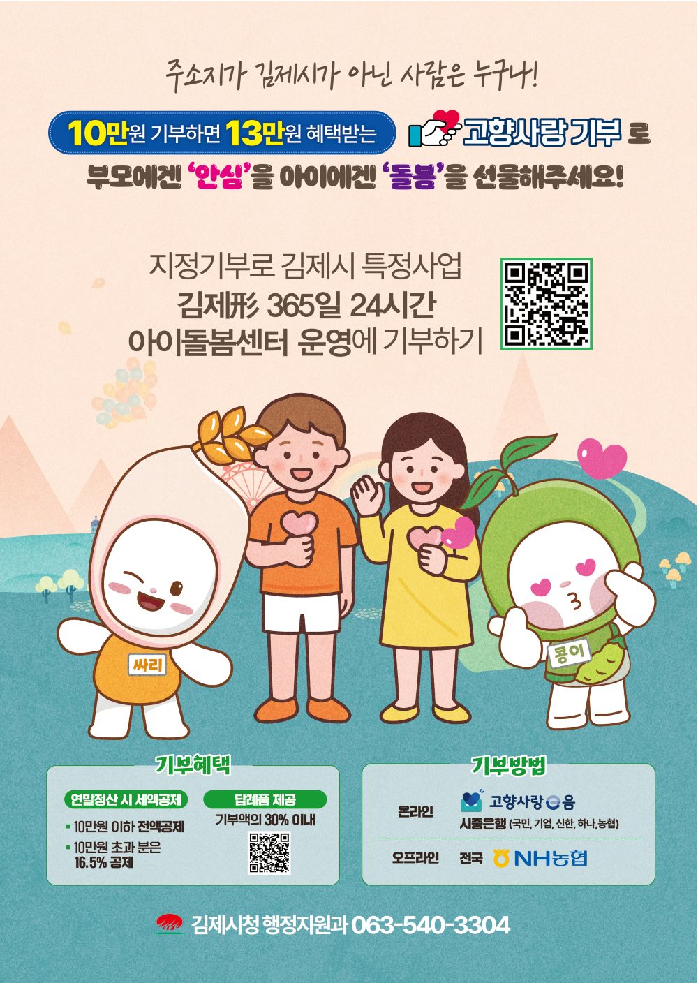 주소지가 김제시가 아닌 사람은 누구나! 10만원 기부하면 13만원 혜택받는 고향사랑 기부로 부모에겐 '안심'을 아이에겐 '돌봄'을 선물해주세요!